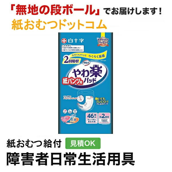 サルバ 紙パンツ用やわ楽パッド 2回吸収 46枚 メーカー:白十字株式会社 サイズ:ウエストサイズ15cm×46cm 尿吸収量:約2回分 商品特徴 ・医療費控除対象商品 ・片手でもパッと装着・交換らくらく ・何度でもつけ直しできる前後2ヶ所のズレ止めテープ ・モレを防ぐハイフィットギャザー ・紙パンツにしっかり収まるあんしん設計 ・pHコントロールパルプ採用により弱酸性・抗菌・消臭(抗菌=大腸菌・黄色ぶどう球菌に対して。消臭=アンモニアに対して) ・排尿量約2回分の吸収量