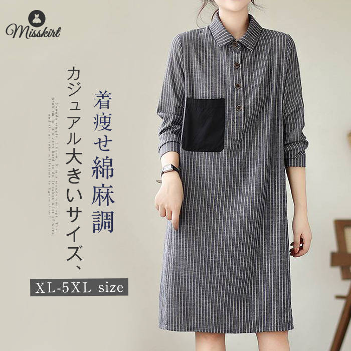 ワンピース シャツワンピース ストライプ レディース 新作 綿麻調 折り襟 プルオーバー 長袖 デザイン感 ボタン ロングシャツ 膝上 ワンピ 大きいサイズ ゆったり 春 秋 カジュアル 通勤 OL オフィス 可愛い 体型カバー お洒落 20代 30代 40代 50代 大人 着回し 送料無料