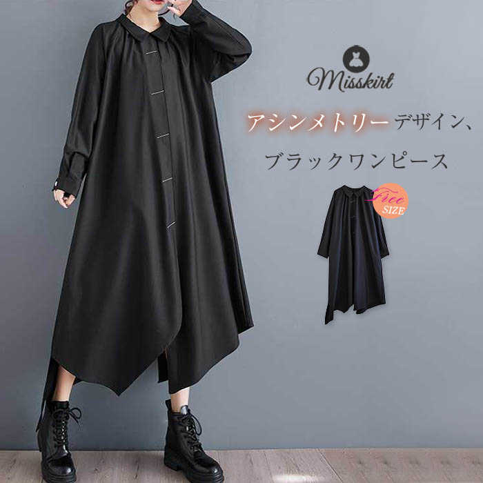 ワンピース シャツワンピース アシンメトリー レディース ロング ワンピ デザイン感 後ろボタン 長袖 プルオーバー 新作 春 秋 無地 ゆったり 着瘦せ おしゃれ 体型カバー カジュアル かわいい シャツ袖 エレガント 大人 通勤 OL オフィス 20代 30代 40代 50代 送料無料