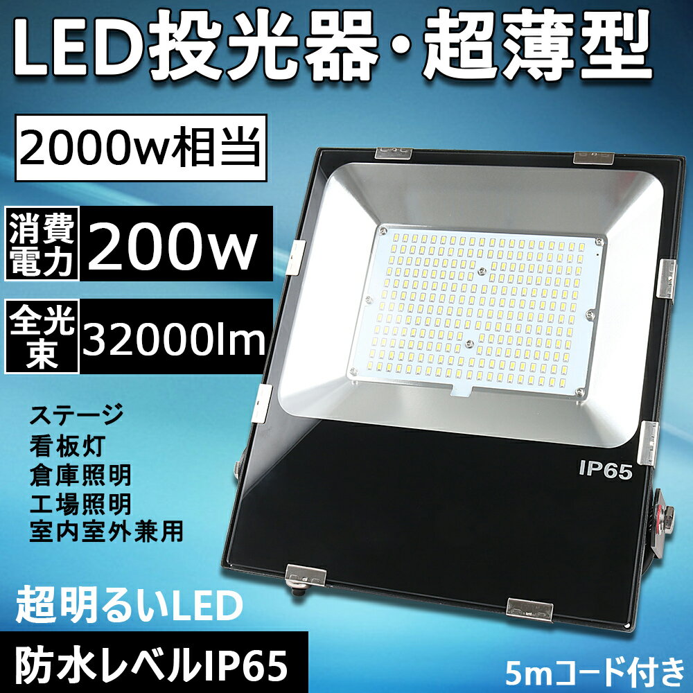 led投光器 200W 全光束32000lm 超高輝度 2000W相当 防水IP65 led作業灯 LED投光機 超薄型 広範囲照射可 スポットライト 水銀灯 ハイベイライト 高天井照明 看板照明 高天井用led照明 ステージ照明 屋内 屋外 ワークライト 防犯 明るい 看板スポットライト 二年保証【昼白色】