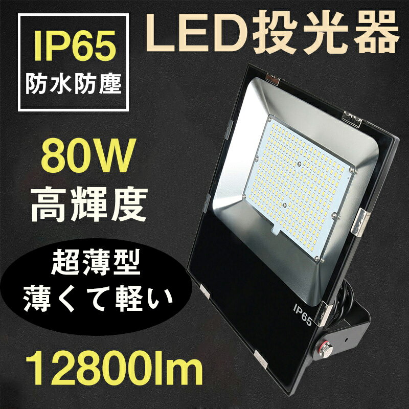 【薄型投光器】新型led投光器 消費電力80W 800W相当 全光束12800lm 防水レベルIP65 広範囲照射可 スポットライト 作業灯 水銀灯 ハイベイライト 高天井照明 高天井用led照明 ステージ照明 工事現場照明 工場照明 80w投光機 店舗、駐車場 電源内蔵 50000h長寿命 二年保証