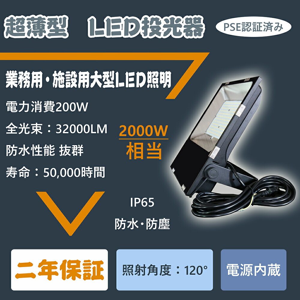 【薄型投光器】新型led投光器 消費電力200W 2000W相当 全光束32000lm 防水レベルIP65 広範囲照射可 スポットライト 作業灯 水銀灯 ハイベイライト 高天井照明 高天井用led照明 ステージ照明 工事現場照明 工場照明 200w投光機 店舗、駐車場 電源内蔵 50000h長寿命 二年保証