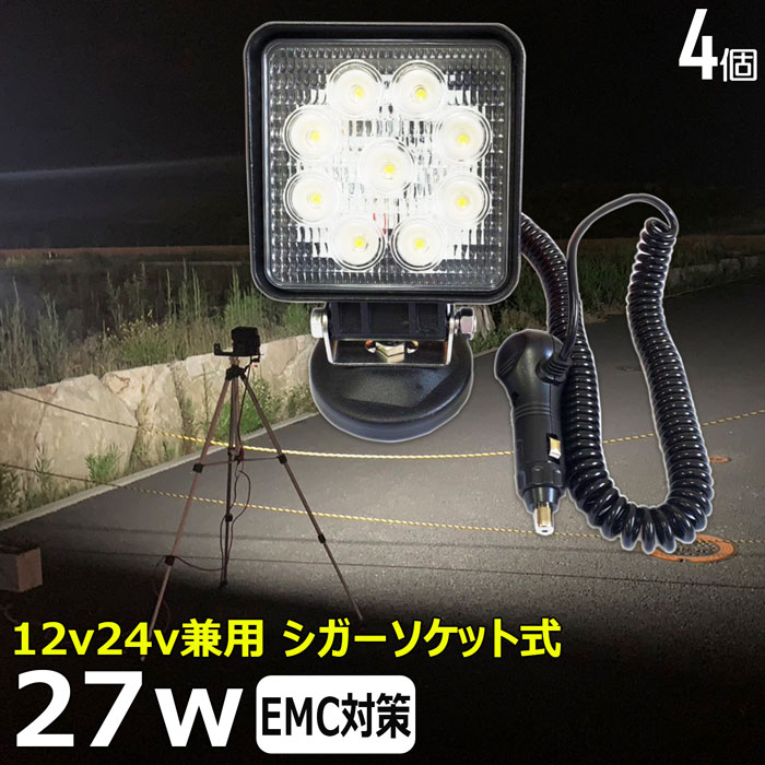 【4個セット】シガーソケット式 27w LEDワークライト LED作業灯 集魚灯 広角 LED投光器 除雪車 除雪機 バック ランプ デッキライト フィッシング サーチライト LEDスポットライト 建築機械用 トラック用 船舶用 フォグランプ 12v/24v兼用 路肩灯 補助灯 タイヤ灯 拡散