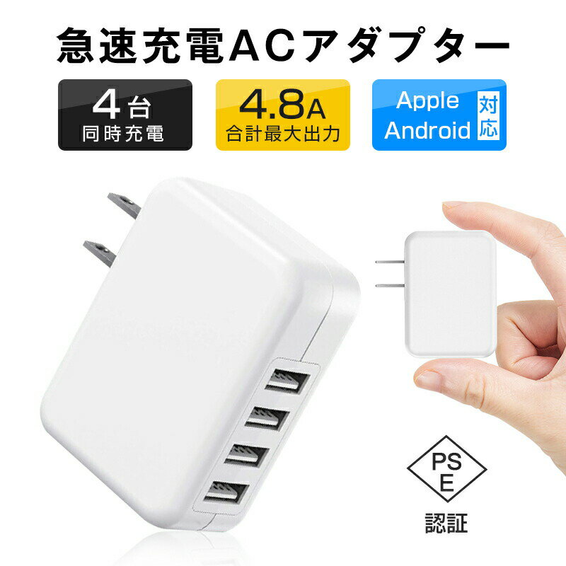 ACアダプター 4ポート USB 充電器 iPhone17/16/15充電可 チャージャー PSE認証 USB充電器 4.8A 4口 コンセント 電源タップ 4USB ACチャージャー 2.4A高出力ACチャージャー iPhone15 iPhone14対応 ゆうパケット 送料無料 【PL保険加入済み製品・安心】