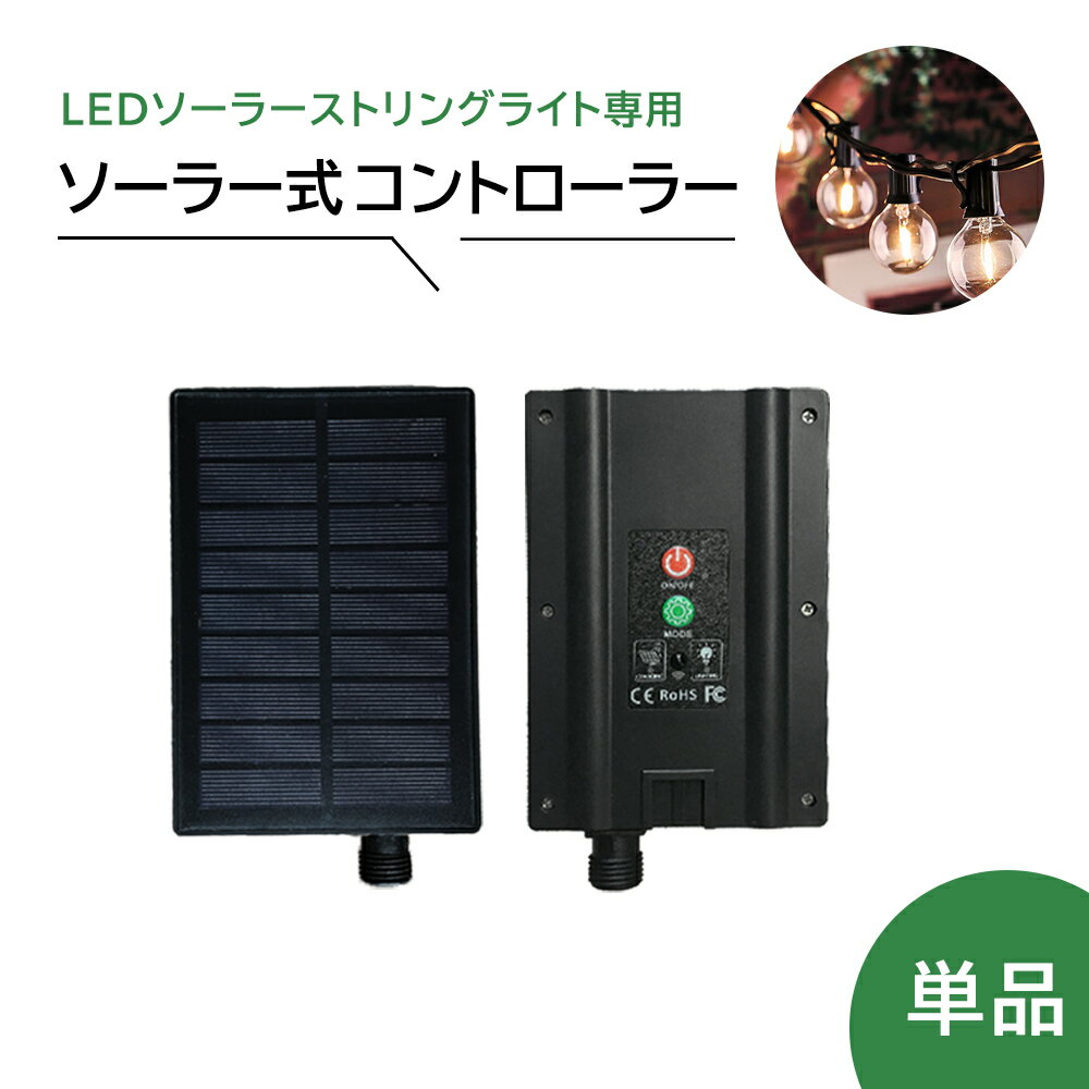 ソーラー式コントローラー 商品説明 当店で販売中のLEDソーラーストリングライト(10個ソケット)専用のソーラー式コントローラー単品販売ページです。 \ このような方におすすめです / お手持ちのLEDストリングライト用ソーラー式コントローラーが ●経年劣化してしまった方 ●水没や破損などで故障してしまった方 また、 ●念のため予備を用意しておきたい方 など。 ソーラー式コントローラーが原因でガーデンライトが点灯しない場合は、交換していただくことで長い間使い続けることができます。 サイズ ※約9.5cm×約14cm 注意事項 ※こちらの商品は当店で販売中のLEDソーラーストリングライト(10個ソケット)のみ対応とさせていただいております。 ※商品の入荷時期によって、ケーブルの色等、仕様が一部変更される場合がありますがご使用には問題ありません。 ※他社製品との併用は発火、破裂、火災、故障に繋がる恐れがあるためお控えください。 ※対応商品一覧をよくご確認のうえ、ご購入をお願いいたします。 ■■こちらの商品専用のソーラー式コントローラー単品となります。■■