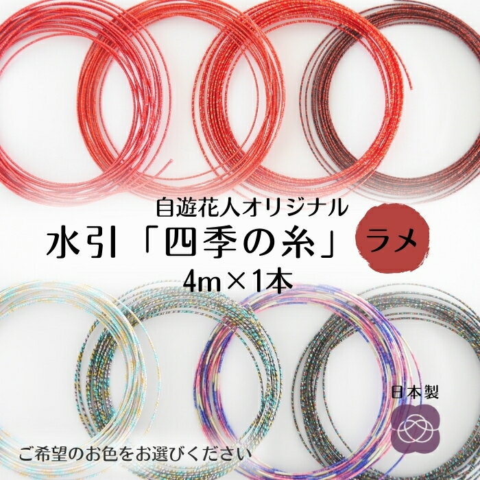 自遊花人オリジナル水引「四季の糸ラメ」 長年たくさんの作品を作り続けてきた作り手が、こんな水引あったらいいな!からスタートしたこだわりの水引。 【ポイント1】長さ(400cm) 400cmの長さで、大きな作品にもチャレンジできます。 【ポイント2】しなやかさ・作りやすさ とにかく柔らかい。やり直してもほとんどクセが付かず、納得の形までとことん追求できます。 【ポイント3】発色の美しさ、色の豊富さ 微妙な色の違いにこだわり、組み合わせを楽しむことができます。 【ポイント4】丈夫さ 水に濡れても型崩れの心配ご無用!汗や汚れも優しく水洗いできます。 水引は、「人と人を結ぶ」という意味を持ちます。 大切な方への贈り物、外国の方へのプレゼントなどに、 日本の伝統工芸の「水引」で手作りの逸品を! 【内容】 四季の糸、基本結びの説明書(説明動画QRコード付) 【水引サイズ】 約 400(単位:cm) →同色の20,000cm(業務用)はコチラ← ※ご注文個数によっては、ご指定の配達方法を変更する場合がございます。ご了承ください。 ※環境やモニターの違いにより、色の見え方は異なります。 ご了承お願いします。 「四季の糸」は、和紙を撚って作った紙芯に飾り糸を巻いたもので「曲げ」や「水ぬれ」にも強く色鮮やかです。 汚れなどは優しく水洗いし、乾いた布でしっかりと水分をお取りください。