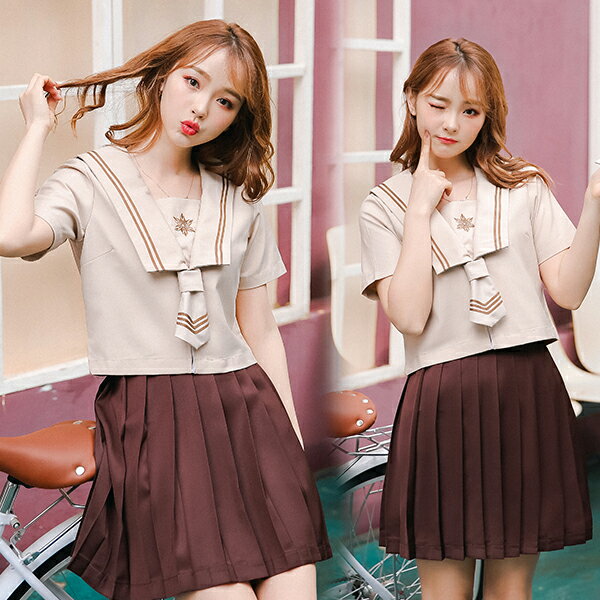 制服 女子高生 セーラー服 上下セット コスプレ セーラー 半袖 ネクタイ コスプレ衣装 ベージュ ブラウン 春 夏 学生服 JK 韓国 普通 定番 プリーツスカート ミニスカ 大きいサイズ 可愛いコスプレ レディース コスチューム マリームーン Malymoon【6761】