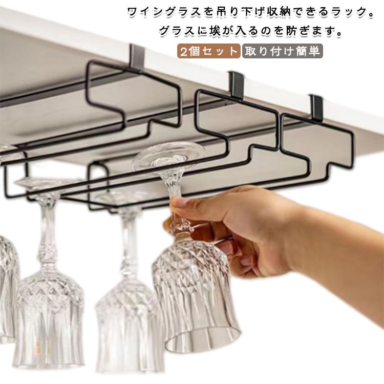【2個セット】ワイングラス ラック 収納 吊り下げ 鉄 戸棚 取り付け簡単 グラスホルダー グラスハンガー ワイングラス収納 吊り戸棚下ラック ホルダー 吊り戸 水切り キッチン グラス 吊り戸棚 グラス掛け 戸棚下 滑り止め