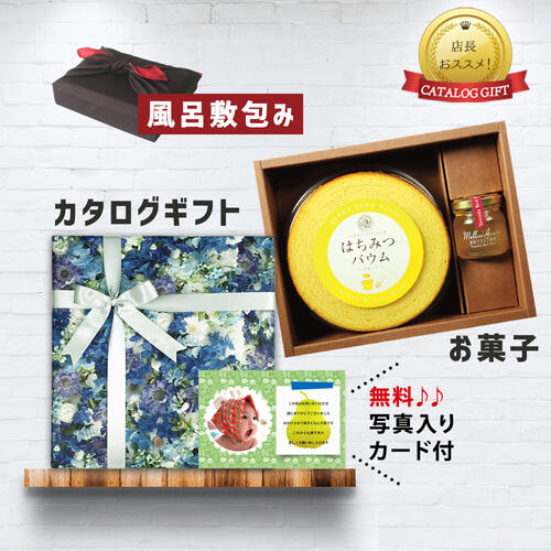 ●こちらの商品は【宅配商品】のため、デジタルメッセージには対応しておりません。 SNSですぐに贈れる【e-Gift】はこちらからどうぞ>>> ●関東より配送します。沖縄、離島、海外へのお届けしておりません。 ●当店では請求書や納品書など、金額の分かる伝票はお品物に同梱しておりません。何卒ご安心下さい。 ●お届け先ご住所の入力間違いや、お届け先様長期ご不在等の理由で、お品物をお届けできず、運送会社での保管期間を過ぎた場合は、お品物はご注文者様へ自動転送となります。 ●宛先不明などにより商品を転送する場合、別途送料が発生いたします。 ●こちらの商品はメーカー包装済のため【外熨斗】のみの対応となります。予めご了承ください。 【商品について】 この商品は、ギフトの2点セットを風呂敷でお包みしてお届けします。 [パティスリー キハチ 焼菓子ギフト(8種13個入)] 国産小麦粉、バター、卵など基本素材の持ち味を活かし焼き上げた、パティスリー キハチ人気のドゥミセックとバームクーヘンをバラエティ豊かに詰合せました。※ドゥミセックとは、半生の焼き菓子の意味。●商品内容:フィナンシェ・はちみつマドレーヌ・マロンケーク×各1、ケークアングレ・マーブルケーク・パルミエ・バームクーヘンプレーン・バームクーヘンショコラ×各2 ●七大アレルゲン:卵、乳成分、小麦 ●賞味期限:製造日より30日 ●宅配時の状態:常温 ●箱サイズ(cm):33.3×21.6×5.8 [カタログギフト] ●体験ギフト・雑貨・グルメが選べるカタログギフトです。画像はイメージです。 ●有効期限は出荷日から6ヵ月となります。 ●カタログギフトの掲載商品は、リニューアルや欠品により改廃を行っています。 ●イメージ画像にある商品が、変更になっている場合がございます。 ●体験商品は、ご利用頂けない地域や、繁忙期などの除外日がございます。 ●お目当ての商品がございましたら事前にお問い合わせ下さい。 ●カタログ掲載商品の海外へのお届けはしておりません。 ▼さまざまな用途でご利用いただけます 【お祝】 結婚祝い 出産祝い 初節句 七五三 入園祝い 入学祝い 卒園祝い 卒業祝い 成人祝い 就職祝い 昇進祝い 新築祝い 引っ越し祝い 引越し祝い 開店祝い 退職祝い 快気祝い 全快祝い 初老祝い 還暦祝い 古稀祝い 喜寿祝い 傘寿祝い 米寿祝い 卒寿祝い 白寿祝い 長寿祝い 金婚式 銀婚式 ダイヤモンド婚式 結婚式 披露宴 引き出物 引出物 結婚引き出物 結婚引出物 ブライダルギフト ウェディングギフト 上棟祝い 記念日 誕生日 結婚記念日 【内祝】 結婚内祝い 出産内祝い 命名内祝い 入園内祝い 入学内祝い 卒園内祝い 卒業内祝い 就職内祝い 新築内祝い 引越し内祝い 快気内祝い 開店内祝い 【お返し・ご挨拶】 お祝い返し お礼 御礼 ごあいさつ ご挨拶 御挨拶 プレゼント お見舞い お見舞御礼 お餞別 引越し 引越しご挨拶 退職 異動 【イベント・記念品】 母の日 父の日 敬老の日 バレンタイン ホワイトデー こどもの日 ひな祭り お正月 文化祭 運動会 七夕 ハロウィン クリスマス ブラックフライデー 年末年始 新生活応援 季節の贈り物 お中元 御中元 お歳暮 御歳暮 お年賀 御年賀 残暑見舞い 年始挨拶 ゴルフコンペ 景品 賞品 粗品 コンペ景品 卒業記念品 定年退職記念品 【弔事・法要】 お香典返し 香典返し 志 満中陰志 弔事 会葬御礼 法要 法要引き出物 法要引出物 法事 法事引き出物 法事引出物 忌明け 四十九日 七七日忌明け志 一周忌 三回忌 回忌法要 偲び草 粗供養 初盆 供物 お供え メモリアルギフト 【商品タイプ】 カタログギフト セレクトギフト カタログ式ギフト ギフトカタログ グルメカタログ 選べるギフト 体験ギフト 老舗ブランド 上質 実用的 高級 シンプル 【ターゲット・関係性】 上司 同僚 部下 友人 両親 親戚 祖父母 子供 会社関係 取引先 男性向け 女性向け 子供向け 家族向け 学生 新社会人 子育て世代 シニア世代 10代 20代 30代 40代 50代 60代 70代 80代 90代 【その他】 即日発送 あす楽対応 可能商品多数 ポイント消化 選べる 人気ランキング入り 大量注文対応 見積書対応 請求書払い 領収書発行 【アイプレゼンツのギフトサービス】 のし無料 ラッピング無料 メッセージカード無料 手提げ袋無料 送料無料 など、各種ギフトサービスも充実しています。 10代?90代まで、幅広い年代や贈る相手に合わせたギフト選びをサポート。 大切な想いを届けるお手伝いを、心を込めてさせていただきます。 ●こちらの商品には、運賃、メッセージカード、のし、ラッピング、梱包資材、運送事故紛失補償などが含まれたパッケージ価格となっております。 ●ご注文のタイミングにより、注文確定後に在庫切れとなる場合がございます。予めご了承下さい。 ●商品リニューアルに伴いパッケージの改訂に加え内容量等の変更が生じる場合がございます。【限定配布中!】▼お得なクーポンはこちらから▼