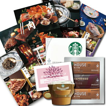 ●お届け日が「仏滅」にあたる場合がございます。「仏滅」を避けてお届けをご希望の場合には、お届け日をご指定いただくか、備考欄へご指示をお願いいたします。 ●当店では請求書や納品書など、金額の分かる伝票はお品物に同梱しておりません。何卒ご安心下さい。 ●お届け先ご住所の入力間違いや、お届け先様長期ご不在等の理由で、お品物をお届けできず、運送会社での保管期間を過ぎた場合は、お品物はご注文者様へ自動転送となります。 ●宛先不明などにより商品を転送する場合、別途送料が発生いたします。 ●大量注文の場合は即日出荷対応が出来ない場合がございます。予めご了承ください。 ●沖縄、離島、海外へのお届けは、しておりません。 【商品について】 ●この商品は、カタログギフトにギフト商品をプラスした、2品1セットのギフトセットです。 [カタログギフト] ●体験ギフト・雑貨・グルメが選べるカタログギフトです。画像はイメージです。 ●有効期限は出荷日から6ヵ月となります。 ●カタログギフトの掲載商品は、リニューアルや欠品により改廃を行っています。 ●イメージ画像にある商品が、変更になっている場合がございます。 ●体験商品は、ご利用頂けない地域や、繁忙期などの除外日がございます。 ●お目当ての商品がございましたら事前にお問い合わせ下さい。 ●カタログ掲載商品の海外へのお届けはしておりません。[スターバックス ドリップ コーヒー] 一杯分の美味しさを味わえるドリップタイプのスターバックスコーヒーです。●商品内容:スターバックスオリガミパーソナルドリップコーヒーハウスブレンド(9g×3)、スターバックスオリガミパーソナルドリップコーヒーカフェベロナ(9g×2)●箱サイズ(cm):26.2×13.2×3.6●宅配時の状態:常温●賞味期間:300日(在庫期間・発送日を含む)※スターバックスコーヒーは旧パッケージで出荷される場合がございます。あらかじめご了承下さい。 ◇◆ 価格から商品を探すにはこちら ◇◆ =================== ¥3,000までの商品 =================== ¥3,000から¥5,000の商品 =================== ¥5,000から¥10,000の商品 =================== ¥10,000以上の商品 =================== [アイプレゼンツのギフト販売用途一覧] 友人の結婚祝い/両親へのお礼/結婚引出物/親戚への結婚内祝い、出産祝い/出産内祝い/新築祝い/母の日/父の日/敬老の日お中元/成人祝い/合格祝い/就職祝い/栄転祝い/誕生日プレゼント/開店祝い/昇進祝い/退職祝い/長寿のお祝い/お見舞い/退院祝い/回復祝い/復帰祝い/退官祝い/送別会/贈答品/定年退職 /賀寿/両親/父親/母親/祖母/祖父への長寿のお祝い ●こちらの商品には、運賃、メッセージカード、のし、ラッピング、梱包資材、運送事故紛失補償などが含まれたパッケージ価格となっております。 ●ご注文のタイミングにより、注文確定後に在庫切れとなる場合がございます。予めご了承下さい。 ●商品リニューアルに伴いパッケージの改訂に加え内容量等の変更が生じる場合がございます。