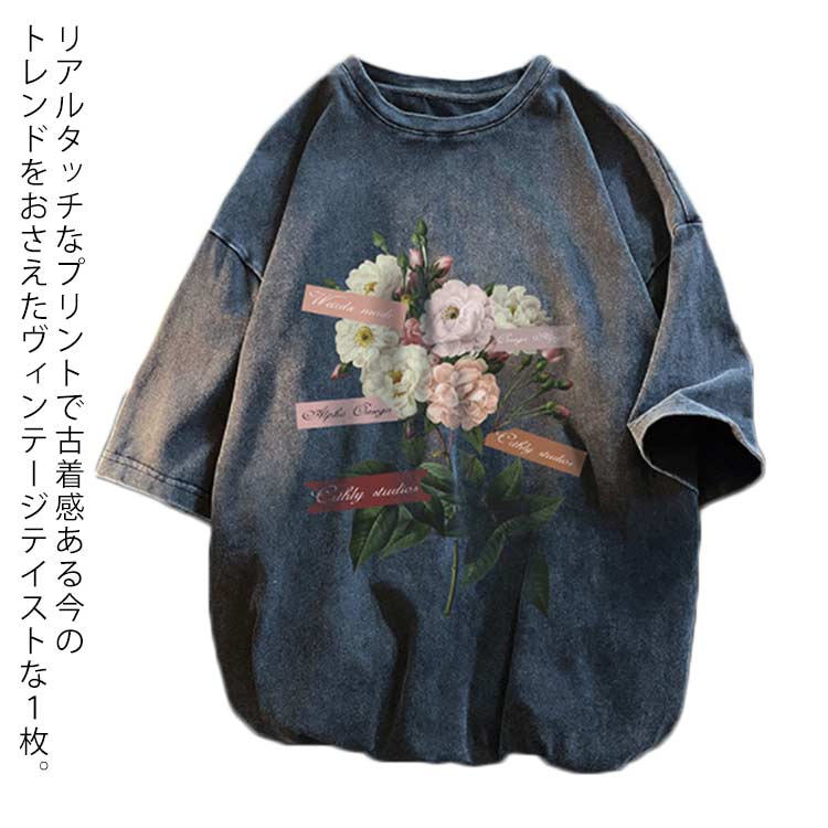 アメカジ tシャツ 半袖 古着風 花束 プリント レディース レトロ 色褪せ感 丸首 カットソー 春夏 ウォッシュ加工 ストリート カジュアル 原宿系 オーバーサイズ ブラック 黒 大きいサイズ【送料無料】