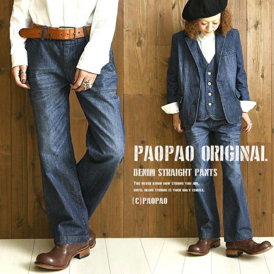 PAOPAO オリジナル ストレート デニムパンツ【古着風 古着加工 綿100% コットン 綺麗目 シンプル アメカジ ストリート ナチュラル 森ガール メンズライク スーツ セットアップ レディース】【あす楽対応】