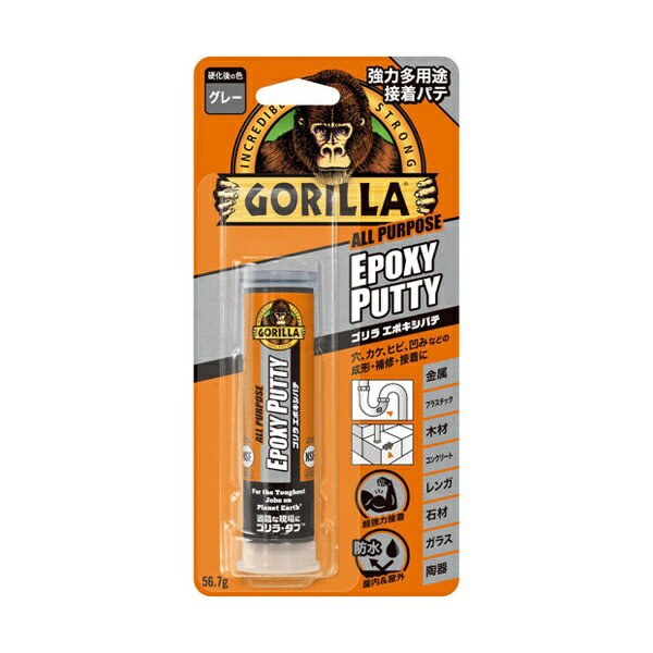 ■さまざまな素材に使用できる多用途強力タイプです。■硬化後はドリル、釘打ち、研磨、塗装が可能です。■水道管にも使用可能です。■JWWA規格Z−108に適合しています。■強力防水で屋内・屋外OKです。■練るだけで簡単&ハードに硬化し、完全硬化後は水中OKです。■(使用後、約1時間で加工可能です)※釘打ちの際は下穴を開けて下さい。【用途】・さまざまな箇所の穴埋め、成形、補修及び接着に。【仕様】・色: グレー(硬化後)・容量(g): 56.7・可使時間: 5分・使用温度範囲: -29〜149℃・表面硬化: 約10分(完全硬化: 24時間)・可使時間: 5分【材質/仕上】・主成分: エポキシ樹脂