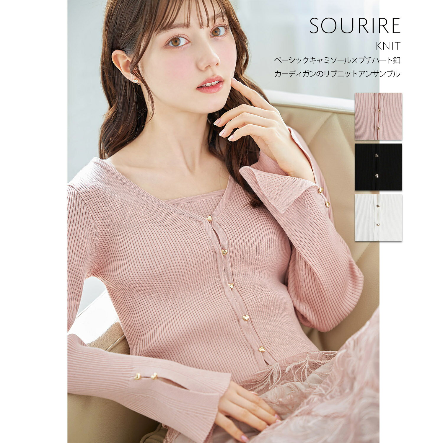 ベーシックキャミソール×プチハート釦カーディガンのリブニットアンサンブル【sourire ソリール】tocco closet(トッコクローゼット) ピンク ブラック オフホワイト 商品番号:186-183202