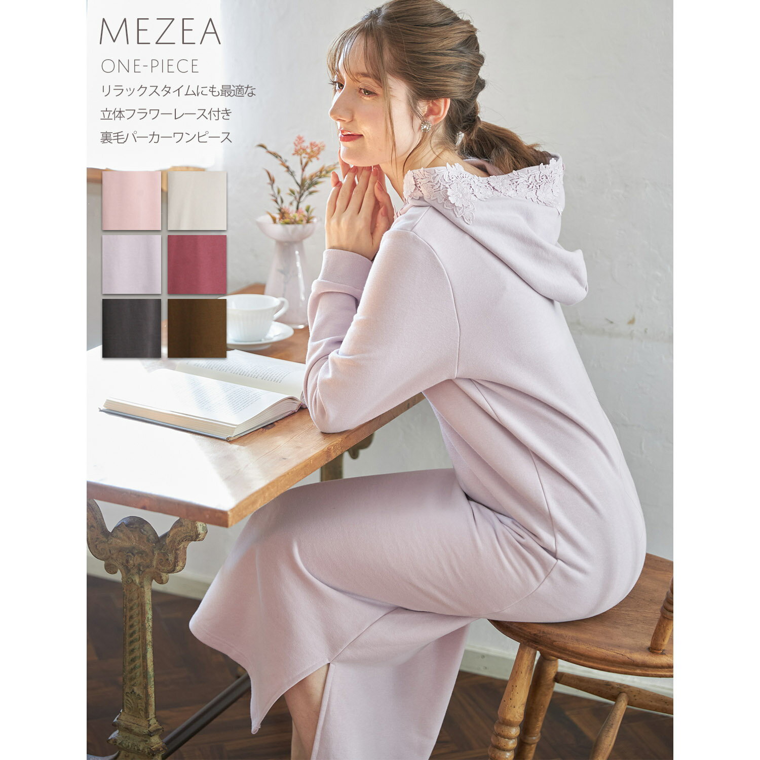 リラックスタイムにも最適な立体フラワーレース付き裏毛パーカーワンピース【mezea ミゼア】tocco closet(トッコクローゼット) グレイッシュラベンダー チャコール ピンク 商品番号:186-181182 【楽天・ZOZO限定アイテム】