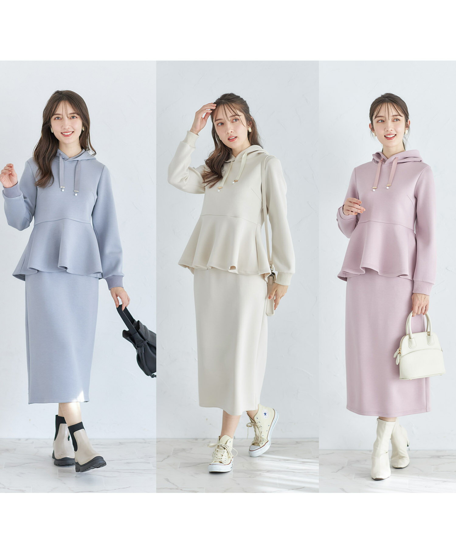 フード付きペプラムトップス+タイトスカートセット【laphne ラフネ】tocco closet(トッコクローゼット) グレイッシュブルー グレイッシュピンク オフベージュ 商品番号:186-182172 【楽天限定アイテム】
