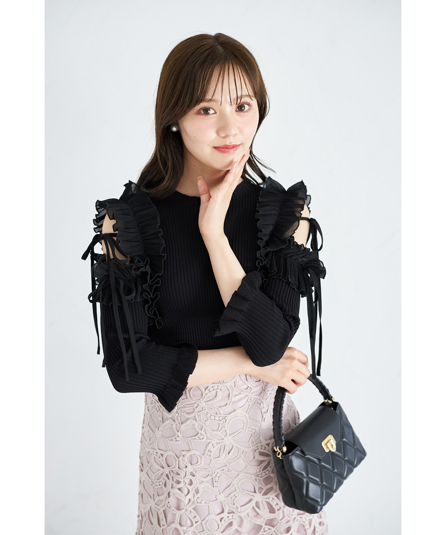 【falily】 りぼん付きシフォンプリーツ切り替えリブニットプルオーバー りぼんをあしらったシフォンプリーツ切り替えで ヘルシーな肌見せができるデザインに。 今までにない高感度な甘さの洒落感で目を惹きます。 袖口にもプチフリルを施し、フェミニン感たっぷり♪ コンパクトに着られるリブニット生地で引き立てました。 シンプルなボトムスと合わせるだけで着映えます◎ #49 オフホワイト model:169cm #05 ブラック model:166cm model:169cm #33 ピンク model:169cm #47 モカ model:166cm Detail Color ●サイズは平置きサイズとなりますので測り方により誤差が出る場合がございます。 ●色合いはモニター環境により若干の誤差が出ます。 ●ライティングや天候によりモデル画像と物撮り画像のカラーに違いある場合、物撮り画像の方が 実際のカラーに近い状態で撮影されておりますので、そちらを参考にしてくださいませ。 NO 186-182495 ITEM りぼんをあしらったシフォンプリーツ切り替えで ヘルシーな肌見せができるデザインに。 今までにない高感度な甘さの洒落感で目を惹きます。 袖口にもプチフリルを施し、フェミニン感たっぷり♪ コンパクトに着られるリブニット生地で引き立てました。 シンプルなボトムスと合わせるだけで着映えます◎ Material ニット部分:レーヨン70%、ナイロン30% 別布:ポリエステル100% Detail 着丈:54.5cm 肩幅:33cm 袖口幅:8cm 身幅:34cm 袖丈:31cm 裾幅:34cm Color #49 オフホワイト/ #05 ブラック/ #33 ピンク Attention ●サイズは平置きサイズとなりますので測り方により誤差が出る場合がございます。 ●色合いはモニター環境により若干の誤差が出ます。 ●ライティングや天候によりモデル画像と物撮り画像のカラーに違いある場合、物撮り画像の方が 実際のカラーに近い状態で撮影されておりますので、そちらを参考にしてくださいませ。