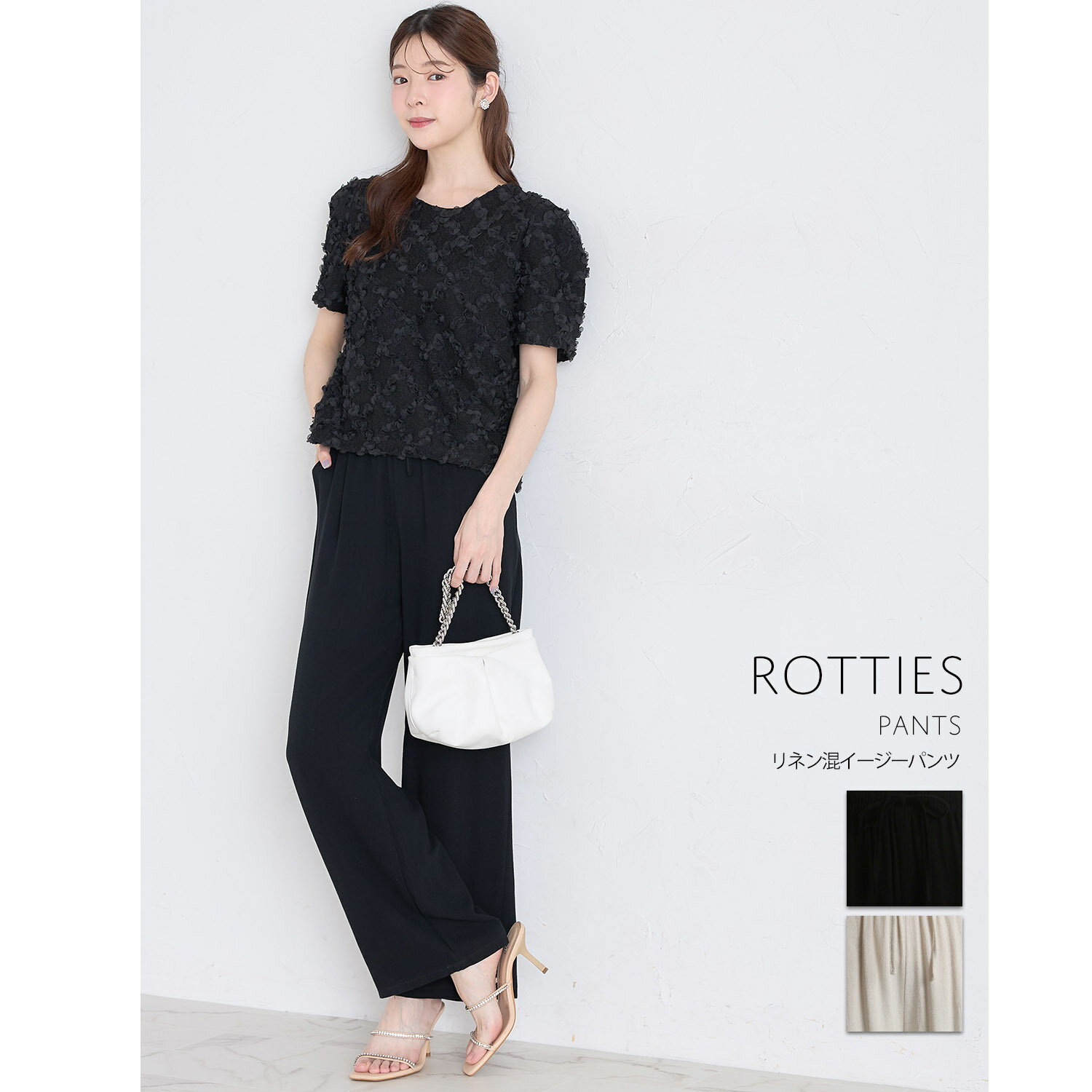 【楽天限定】リネン混イージーパンツ【rotties ロティース】tocco closet(トッコクローゼット) ブラック ベージュ 商品番号:186-198107