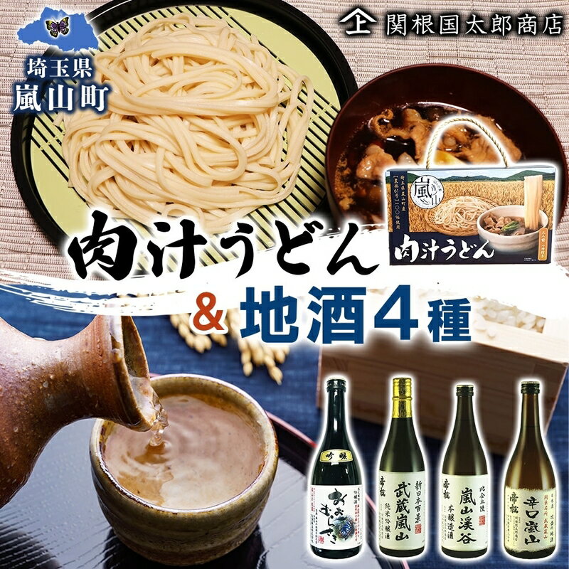 【ふるさと納税】嵐山町 肉汁うどん 1箱 嵐山町地酒 720ml 4本セット 純米酒おおむらさき 純米吟醸武蔵嵐山 本醸造嵐山渓谷 辛口嵐山 お酒 日本酒 晩酌 フルーティー 嵐山町 限定 爽快 キレ 辛口 地酒 旨み コク 小麦 うどん 肉汁うどん 農林61号 関根国太郎商店