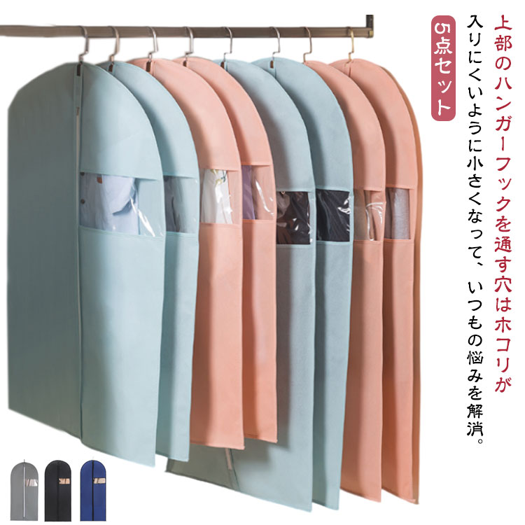 通気性良好 ほこり除け 5枚入り 洋服カバー ハンガー 衣装カバー 不織布 衣類カバー 衣類収納袋 クローゼット収納 押入れ収納 型崩れ防止