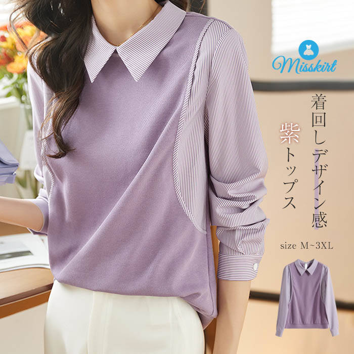 シャツ ブラウス パーカー レディース 新作 長袖 綿 ストライプ フェイクレイヤード トップス 折り襟 プルオーバー デザイン感 着痩せ 切り替え オフィス 通勤 OL おしゃれ 可愛い 春 秋 大人 エレガント カジュアル 大きいサイズ 20代 30代 40代 50代 着回し 送料無料