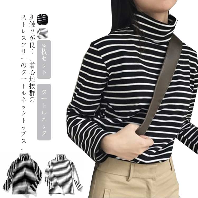 2枚セット tシャツ タートルネック ハイネック カットソー レディース 長袖 Tシャツ ストライプ柄 ロンT 大きいサイズ インナー 薄手 トップス 重ね着 レイヤード ルームウェア おしゃれ かわいい 春 夏 秋 冬 送料無料