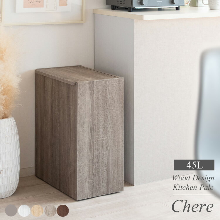 【北海道、沖縄県、離島への配送は別途配送料が必要となります。見積り致しますのでご注文前にメールにてご確認お願い致します】 毎日使うキッチンだから見た目もこだわりたい。そんな方にピッタリの木製キッチンペール『Chere(シェール)』。 ゴミ箱だと分かりにくいスタイリッシュなデザインでキッチンに馴染みます。たっぷり入る45Lで、ニオイ漏れを防ぐフタや移動がラクにできる隠しキャスター付きで利便性も抜群。 横置き・縦置きどちらも可能で奥行き26.5cmと省スペースなのでキッチンやカウンターの隙間に置けます。場所を選ばないデザインでデスクや寝室にも最適。 お部屋に馴染みやすい木目柄のホワイト、ナチュラル、グレージュ、ブラウン、高級感のある大理石柄ホワイト、可愛い無地のモカの6カラーをご用意。お好みでお選びください。 商品名キッチンペール Chere(シェール) サイズ幅45×奥行き26.5×高さ61cm(オープン時高さ:84cm) 材質合成樹脂化粧パーティクルボード(塩化ビニル) 備考組立式(約30分)、対応ポリ袋:45L 検索キーワード:ゴミ箱 45リットル 消臭 分別 おしゃれ 黒 ふた付き スリム パッキン ふたなし プッシュ キャスター スリムペダル ふた付き ふた付きスリム 防臭 ふた付き25l 幅20 スライド 45l 30 ミニ 木目 木目20リットル 木目調 プッシュ式 プッシュ くず箱 ごみ箱 プッシュ 木製 お洒落 おしゃれ オシャレ 大容量 扉式 インテリア 密閉 臭い漏れ 臭くない プッシュ式 開閉
