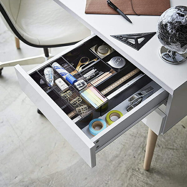 5 伸縮・フィットするデスクトレー●伸縮できるから引き出しのサイズに合わせてピッタリフィットするデスクトレー。 ●スライド式の上段トレーには消しゴムやクリップ、スティックのりなどの小物を分けて収納できます。 ●伸縮式の下段トレーにはペンやはさみだけではなく、定規などの長いステーショナリーも収納できます。 ■サイズ :約w25XD24.6XH5.7cm ■本体:ABS樹脂 上段トレー:PS樹脂 ■耐熱温度 :80℃ ■耐冷温度 :-40℃ ■対応サイズ :幅・奥行約25~45cm以上 高さ約6以上の引き出し(内寸) ■生産国:中国