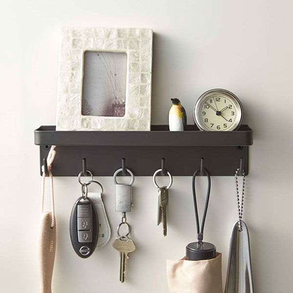 はがきや印鑑も収納できる便利なトレイ付きの、上下2段式のキーフックスタンドです。スリムでシンプルなデザインなので、玄関やリビングなど、様々な場所にすっきり置けます。