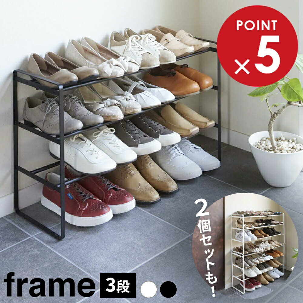 山崎実業 靴 収納 フレーム 伸縮シューズラック 3段 ホワイト 7555 / ブラック 7556| 伸縮 靴箱 玄関 おしゃれ くつ 下駄箱 玄関収納 大容量 白 黒 シンプル