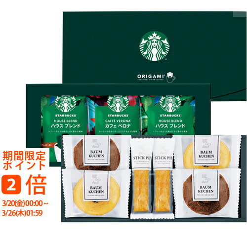 ギフト対応【送料無料】■商品名:スターバックスコーヒー&スイーツギフト■商品内容:スターバックスオリガミドリップコーヒー(ハウスブレンド×3・カフェベロナ×2)各9g、バウムクーヘン(ココア・バニラ)各2、スティックパイ(プレーン)×2 【卵・乳成分・小麦】■賞味期間:120日間■生産国:日本■箱:約135×265×105mm※ご注文・配送状況などにより、最短発送日を変更させて頂く場合がございます。結婚式 披露宴 結婚引出物 結婚引き出物 ご結婚内祝い ウェディング ギフト ブライダルギフト 引出物 引き出物 人気の引出物 人気の引き出物 出産祝い 結婚祝い 内祝い 内祝 出産内祝い 新築内祝い 快気祝い お返し 記念品 ごあいさつ 香典返し 満中陰志 のし無料 オリジナルカード 無料オリジナルカード フォトカード カタログ ギフト ギフトカタログ カタログ式ギフト チョイスギフト お買い得カタログ チョイスカタログ グルメカタログ カタログタイプギフト プレゼント
