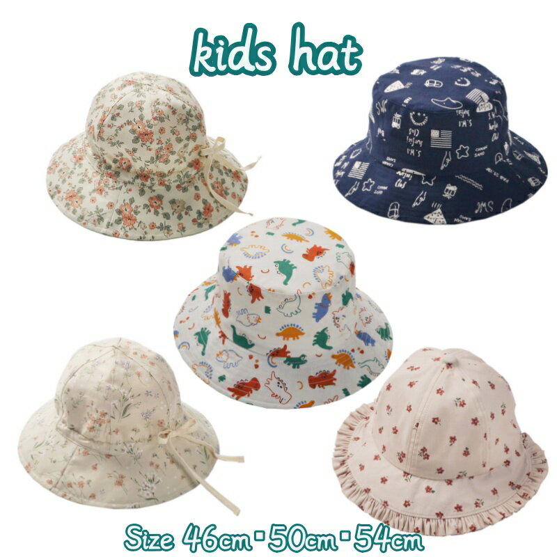 【BLACK FRIDAY ポイント10倍】 キッズ 帽子 ハット 46cm 50cm 54cm かわいい 春 夏 UVカット 可愛い おしゃれ フリル 赤ちゃん ベビー ハット お出かけ 通園 通学 旅行 旅 海 人気 綿 コットン100% シンプル 日焼け防止 つば広ハット 男児 女児 ダイナソー プリント