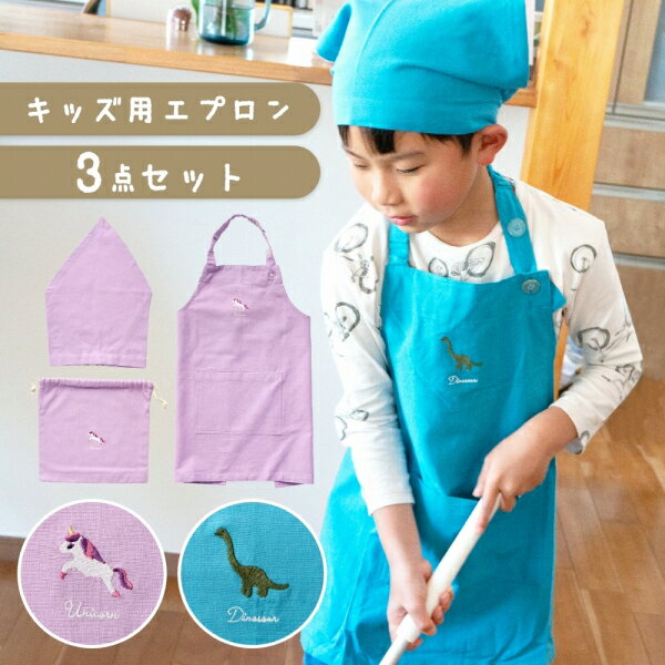 【ネコポス送料無料】キッズ用エプロン3点セット(三角巾&収納袋付き) ( エプロン キッズ セット 子供用 おしゃれ 可愛い 小学生 ユニコーン 恐竜 ダイナソー プレゼント ギフト お祝い 入園準備 送料無料 女の子 男の子 女児 男児 女子 男子 )