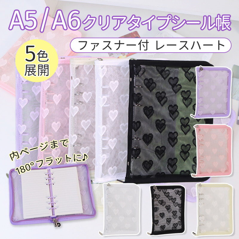 シール帳 バインダー 透明 A5/A6レース メッシュ ハート柄 かわいい ファスナー仕様 クリア シールバインダー システム手帳 カスタマイズ PVC 防水 手帳 女の子 アルバム トレカ収納 DIY 推し活グッズ ギフト