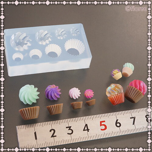【カップケーキ】ミニチュア/お菓子/焼き菓子/モールド/ 樹脂粘土をはじめとする自然乾燥粘土、オーブン粘土・純銀粘土、UVレジンや2液性のエポキシ樹脂・発泡ウレタンなど化学変化によって硬化するものでご使用頂ける便利なシリコーン型です。 粘土などを型につめて抜くとカップケーキのパーツが出来ます。ホイップパーツを取り外す時は口を広げて抜いてください。紫外線を透過するためUV硬化素材にも使用できます。 ★シリコーン製オイルブリードタイプ 硬さ(デュロメータA):40切断時伸びパーセント:350 ★使用できる回数 材質はオイルブリードのシリコーンになります。 離型剤が混入しているシリコーンですので、抜くときに離型剤を塗る必要がありません。 ただし材料によっては無制限に抜けることはありませんので、ご理解ください。 レジンなどの化学変化して硬化する物は10〜20個程度で中のオイルが出てしまいますので、それ以降は離型剤が必要になります。 おおよそ30〜40回程度で使えなくなります。最後はレジンがくっついて離れなくなります。 経年変化によって無限には使えません。 *色々なメーカーがUVレジン・2液混合レジンを発売していますが中には溶液がとても強く、型を数回で痛めてしまいシリコーン型との相性の悪いレジン商品もございます。 ★保管方法 日の当らないほこりがしない場所に保管してください。 ご使用後は子供など手の届かない場所で保存してください。 オイルが混入していますので、子供が間違って口の中に入れた際には、 よくうがいしたのち必要があれば医師の診察を受けてください。 仕上がりサイズ: 【ホイップ】φ13.5×H10/11×H8/φ8×H6/φ7×H5mm 【ケーキ】φ13×H8/φ10×H7/φ8×H6/φ6×H4mm モチーフ1つに必要なおおよそな樹脂粘土量: 大2g 中1g 小・極小1g以下 C-647 【注意事項】 ・本製品は食べられません。 ・小児の手の届かない所に保管してください。 ・本製品は直射日光、高温多湿での保管は避けてご使用下さい。 ・使用条件により、変色・変形・色落ちや品質劣化する場合があります。