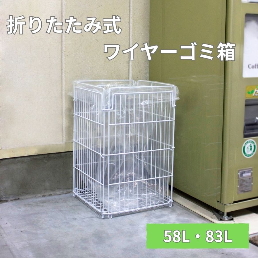 商品名 ワイヤーバスケット サイズ 58L:W340×D340×H600mm83L:W400×D400×H630mm 重量 58L:約2.5kg83L:約3kg 材質 スチール綿材にポリエチレンコーディング 備考 ●折りたたみ式(58L)●市販のポリ袋は70Lが使用できます。(83L)●市販のポリ袋は90Lが使用できます。