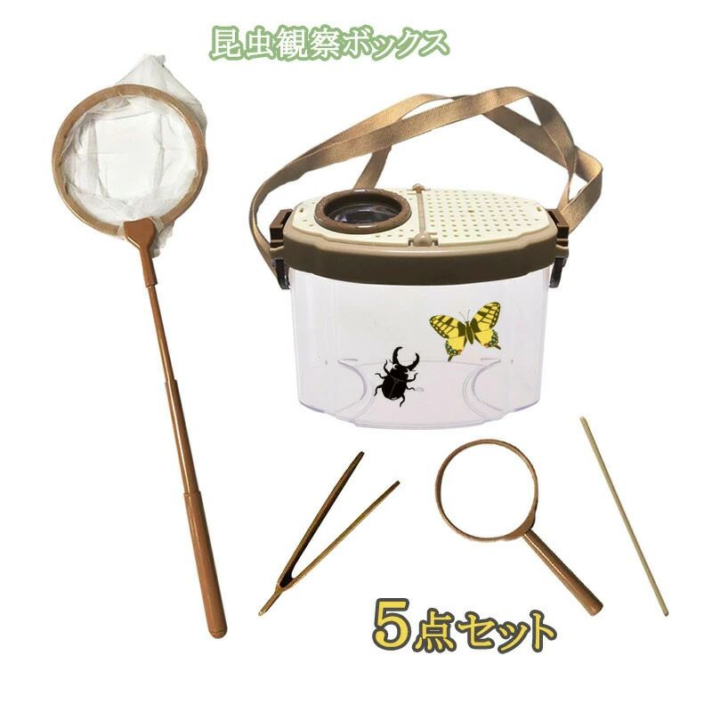 \5倍ポイント/虫かご 昆虫ケース 飼育ケース 昆虫 観察 むしとり 昆虫ケージ 観察ケース 昆虫採集 飼育観察 虫篭 おしゃれ カブトムシ クワガタ ちょうちょう 魚 虫取り網 セミ 子ども キッズ 夏休み 自由研究 拡大鏡 ピンセット あみ 紐付き プレゼント 5点セット