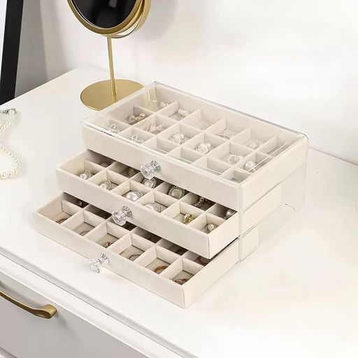 高級素材でジュエリーを優しく保護:当商品のアクセサリーボックスは、内側に柔らかなジュエリートレイを採用しております。ピアスケースの内箱は高級フェルト生地を使用しており、ピアスやネックレスケースとしてご利用いただいても、繊細な宝石やメッキ製品を傷つけません。外箱は強化アクリルケース製で、衝撃に強く変形しにくい設計です。防水·防塵加工が施されており、ジュエリー収納バッグよりも衛生的でお手入れ簡単です。※新品時にはフェルトの微細な浮き毛が付着する場合がございますが、軽く拭き取っていただければ問題なくご使用いただけます。 スムーズな3段引き出しで快適アクセス:3段アクセサリートレイの各段は、スムーズな開閉を実現しました。引き出し式のオーガナイザー設計により、重ねた状態でも最下段のピアス入れまで片手で簡単にアクセス可能です。密閉式の防塵ボックス構造で、貴重なルースケースやイヤリングケースの保管に最適。旅行用収納ボックスとしても、移動中のほこりや湿気からアクセサリーを守ります。