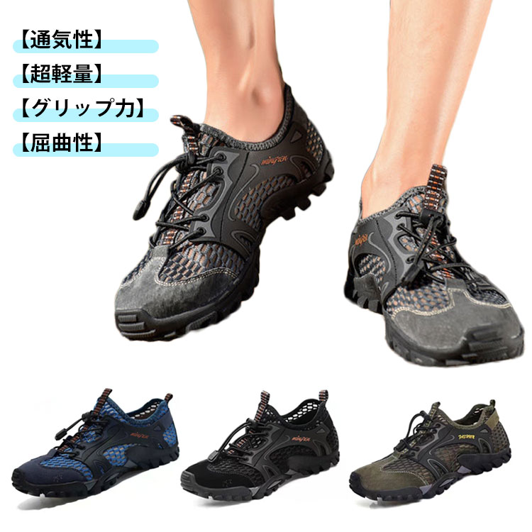 通気性】靴の中に通気性と肌触りが良い、足をしっかりと包み、素足のように疲れません。通気性/水はけも良く、素足でもストレス無く着用いただけます。自由に走るのはより爽快で快適です。【超軽量】非常に軽い素材で作られているので、靴全体は軽くて、足に負担をかけません。長時間歩いても疲れにくいです。【グリップ力】滑り止めと耐摩耗性を兼ね備えた靴底を採用しました。グリップ力があり、滑りやすいシーンでも足元の安全を保ちます。熱くなった砂浜や岩場、貝殻のかけらなどから足を守るシェルのような役割を果たします。【屈曲性】ソールは上品なゴムを採用します。非常に柔軟です。屈曲性があります。極限まで柔らかくし素足感を追求します。【快適なインソール】インソールに排水溝を設計しており、靴がもっと優れる通気性になり、いつも快適な心地をキープします。柔らかくてクッション性のあり、両足のストレスを和らげます。 サイズ 39(24.5cm) 40(25cm) 41(25.5cm) 42(26cm) 43(26.5cm) 44(27cm) 45(27.5cm) サイズについての説明 39(24.5cm) 40(25cm) 41(25.5cm) 42(26cm) 43(26.5cm) 44(27cm) 45(27.5cm) 素材 メッシュ ゴム 色 ブルー ブラック グレー カーキグリーン 備考 ●サイズ詳細等の測り方はスタッフ間で統一、徹底はしておりますが、実寸は商品によって若干の誤差(1cm~3cm )がある場合がございますので、予めご了承ください。 ●製造ロットにより、細部形状の違いや、同色でも色味に多少の誤差が生じます。 ●パッケージは改良のため予告なく仕様を変更する場合があります。 ▼商品の色は、撮影時の光や、お客様のモニターの色具合などにより、実際の商品と異なる場合がございます。あらかじめ、ご了承ください。 ▼生地の特性上、やや匂いが強く感じられるものもございます。数日のご使用や陰干しなどで気になる匂いはほとんど感じられなくなります。 ▼同じ商品でも生産時期により形やサイズ、カラーに多少の誤差が生じる場合もございます。 ▼他店舗でも在庫を共有して販売をしている為、受注後欠品となる場合もございます。予め、ご了承お願い申し上げます。 ▼出荷前に全て検品を行っておりますが、万が一商品に不具合があった場合は、お問い合わせフォームまたはメールよりご連絡頂けます様お願い申し上げます。速やかに対応致しますのでご安心ください。