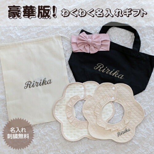 【豪華版ギフトセット】 名入れ 刺繍 名前入り スタイ よだれかけ ギフト セット プレゼント 出産祝い トートバッグ バッグ ヘアバンド 食事エプロン 防水 撥水 360度 巾着 巾着袋 袋