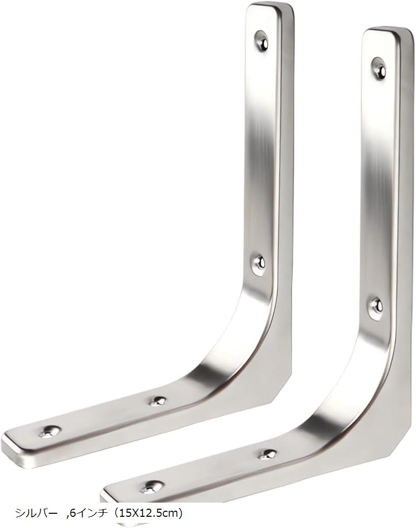 棚受け 金具 L字型 ブラケット ステンレス製 2本入 壁 棚支え ネジ付 (シルバー, 6インチ(15X12.5cm))