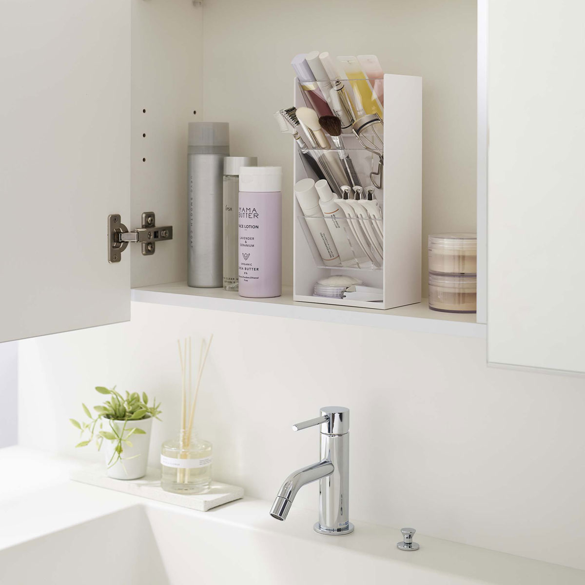 洗面周りにコスメをまとめて一括収納! 洗面周りにコスメをまとめて収納、TOWER コスメ立体収納ケース 4段。トレーは差し込むだけの簡単取り付け。トレーが透明のため、中身が見やすく整理も簡単。メイクブラシ・リップ・アイライナーなどを取り出しやすいように斜めに収納できます。 トレーは差し込むだけの簡単取り付け! 機能性はもちろん、そのデザイン性も人気のタワーシリーズより、底面には滑り止めクッション付き「TOWER(タワー)コスメ立体収納ケース 4段」。TOWERのシンプルなフォルムはどんなインテリアにも相性が良く、空間をスタイリッシュに飾ります。 商品の情報 ・ブランド:YAMAZAKI(山崎実業)/日本 ・ジャンル:コスメ収納 ・主な素材:ABS樹脂(本体)/ポリカーボネート(トレー)/シリコーン(滑り止 め) ・生産国:中国 ・サイズ:約W120xD77xH250mm(本体)/約W114xD70xH247mm(ケース内寸) ・重量:約325g ・耐荷重:約300g(トレー1つあたり) この商品の仲間たち 山崎実業 TOWER コスメ立体収納ケース 4段 ホワイト 山崎実業 TOWER コスメ立体収納ケース 4段 ブラック