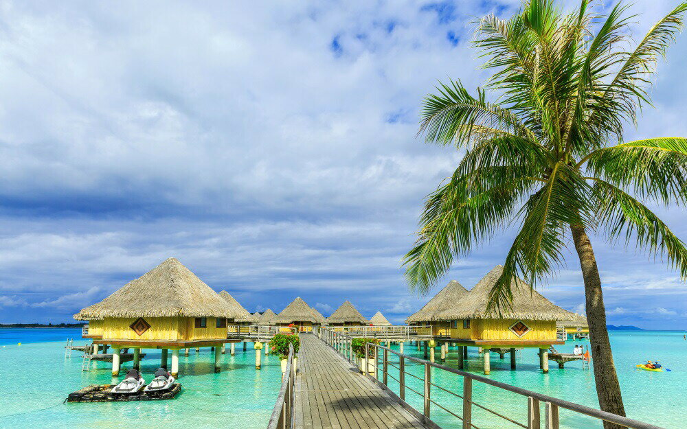 絵画風 壁紙ポスター (はがせるシール式) ポリネシア ボラボラ島 水上コテージ ヤシの木 リゾート 癒し キャラクロ RPLN-010W2 (ワイド版 603mm×376mm) <日本製> ウォールステッカー お風呂ポスター