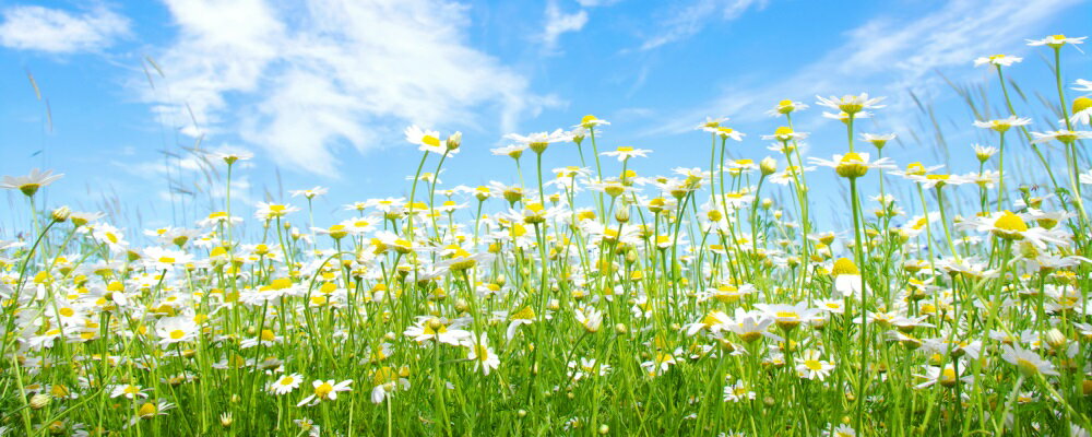 絵画風 壁紙ポスター (はがせるシール式) カモミールと青空 花畑 フラワーガーデン パノラマ キャラクロ FLGD-103P1 (パノラマ版 1440mm×576mm) <日本製> ウォールステッカー お風呂ポスター