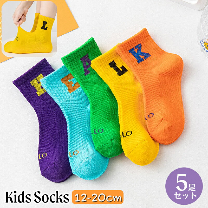 送料無料 靴下 クルーソックス 5足セット 子供用 キッズ ベビー 女の子 男の子 くつ下 カラフル ロゴ アルファベット おしゃれ 可愛い ポップ 派手め カジュアル デイリー 普段使い 女児 男児 小学生 幼児 幼稚園 保育所 学校 スクール 子ども こども