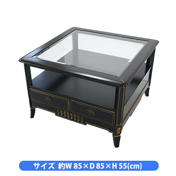 送料無料 ロココ調 センターテーブル ブラック ガラス天板 約W85×約D85×約H55(cm) ローテーブル 引き出し付き テーブル リビングテーブル コーヒーテーブル 収納付きテーブル 正方形 おしゃれ ウッドテーブル 一人暮らし 座卓 テーブル ガラス 机 収納 リビング 黒 6520