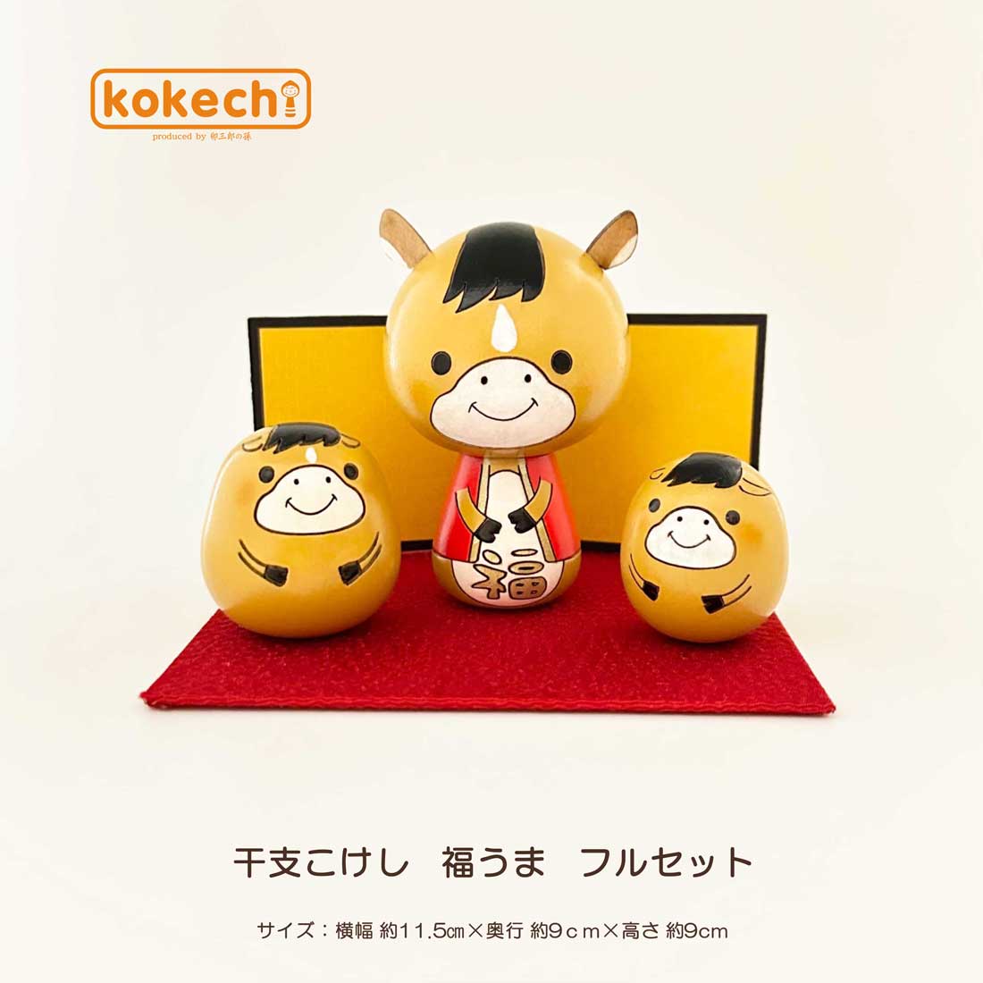 商品について ■商品説明文 キュートな3匹の午年の馬(うま)さんが新しい年を温かく見守ります。新年に干支の置物を飾ると福を招くといわれており、人気の高いアイテムです。 こども目線を重視して、小さなお子さまから大人まで楽しめるこけしを。卯三郎の孫が作るこけしはどれも手のひらに収まるほどコンパクトでかわいいサイズです。小さい子供でも手に取れて木の温もりを感じる、日本の伝統に触れる。そんな光景を想像しながら一つひとつ丁寧に手作りしています。お部屋のインテリアに自然ととけこむkokechi。大切な方への贈り物・ギフトにもご利用いただいています。 ■サイズ 飾り付けサイズ:横幅約11.5cm×奥行約9cm×高さ約9.5cm ■素材/材質 こけし:水木(国産) 注意事項 ※手づくりのお品物ですので、絵柄、表情、色味、大きさ等が画像と異なる場合がございます。 ※またこけしは自然の天然木を使用しているため、お品ごとに木目や木肌に若干の違いがございます。 ※画面上と実物では色具合が多少異なって見える場合もございます。 以上の点についてご理解、ご了承いただきますようお願いいたします。 ※こちらの商品は実店舗でも販売しております関係上、ご購入のタイミングによっては品切れが発生する場合もございます。 大変恐れ入りますが、その場合はキャンセル対応をさせていただきますこと、予めご了承ください。 関連商品 幸福だるま 招き猫セット 干支こけし福桜うさぎセット 【GIFT】【GIFTonenga】【ENGI】【ENGIeto】【INTE】【INTEanimal】【RECO】日本のアートと伝統 日本の丁寧で繊細なものづくりと技術。 見るだけで癒される木のこけし 丸みのある寸胴フォルムは木の実などの形からイメージされて生まれました。 それぞれの可愛いらしさがぎゅっと詰まったこけしです。 こけし作家『卯三郎の孫』の世界観とやさしい木の質感がよくマッチして、見ているだけで癒されます。 しあわせを守る こけしの始まりは江戸時代。心身回復、五穀豊穣、子ども向けのお土産品として作り始めたことがこけし誕生の有力な説なのだそう。 日々のしあわせや安泰を願う気持ちは現代もおなじ。祝福や励ましの気持ちが、こけしを介して大切な人へ届きますように。 こけしは、願いのかたち。暮らしに寄り添うお守りです。 お部屋のインテリアに自然ととけこむこけし。 何より、ころんとしたフォルムが本当にかわいいんです。 小さなお子さまから大人まで楽しめるこけし しあわせを願って、 大切な方へ贈るのもいいですね。 インテリア 開運 置物 かわいい