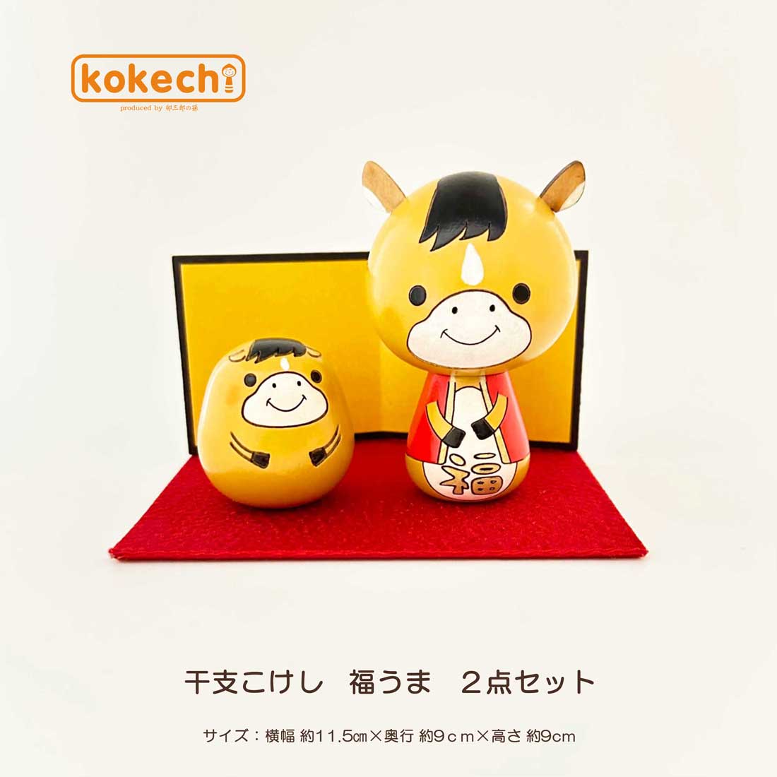 商品について ■商品説明文 キュートな2匹の午年の馬(うま)さんが新しい年を温かく見守ります。新年に干支の置物を飾ると福を招くといわれており、人気の高いアイテムです。 こども目線を重視して、小さなお子さまから大人まで楽しめるこけしを。卯三郎の孫が作るこけしはどれも手のひらに収まるほどコンパクトでかわいいサイズです。小さい子供でも手に取れて木の温もりを感じる、日本の伝統に触れる。そんな光景を想像しながら一つひとつ丁寧に手作りしています。お部屋のインテリアに自然ととけこむkokechi。大切な方への贈り物・ギフトにもご利用いただいています。 ■サイズ 飾り付けサイズ:横幅約11.5cm×奥行約9cm×高さ約9.5cm ■素材/材質 こけし:水木(国産) 注意事項 ※手づくりのお品物ですので、絵柄、表情、色味、大きさ等が画像と異なる場合がございます。 ※またこけしは自然の天然木を使用しているため、お品ごとに木目や木肌に若干の違いがございます。 ※画面上と実物では色具合が多少異なって見える場合もございます。 以上の点についてご理解、ご了承いただきますようお願いいたします。 ※こちらの商品は実店舗でも販売しております関係上、ご購入のタイミングによっては品切れが発生する場合もございます。 大変恐れ入りますが、その場合はキャンセル対応をさせていただきますこと、予めご了承ください。 関連商品 幸福だるま 招き猫セット 干支こけし福桜うさぎセット 【GIFT】【GIFTonenga】【ENGI】【ENGIeto】【INTE】【INTEanimal】【RECO】日本のアートと伝統 日本の丁寧で繊細なものづくりと技術。 見るだけで癒される木のこけし 丸みのある寸胴フォルムは木の実などの形からイメージされて生まれました。 それぞれの可愛いらしさがぎゅっと詰まったこけしです。 こけし作家『卯三郎の孫』の世界観とやさしい木の質感がよくマッチして、見ているだけで癒されます。 しあわせを守る こけしの始まりは江戸時代。心身回復、五穀豊穣、子ども向けのお土産品として作り始めたことがこけし誕生の有力な説なのだそう。 日々のしあわせや安泰を願う気持ちは現代もおなじ。祝福や励ましの気持ちが、こけしを介して大切な人へ届きますように。 こけしは、願いのかたち。暮らしに寄り添うお守りです。 お部屋のインテリアに自然ととけこむこけし。 何より、ころんとしたフォルムが本当にかわいいんです。 小さなお子さまから大人まで楽しめるこけし しあわせを願って、 大切な方へ贈るのもいいですね。 インテリア 開運 置物 かわいい 干支の置物 馬