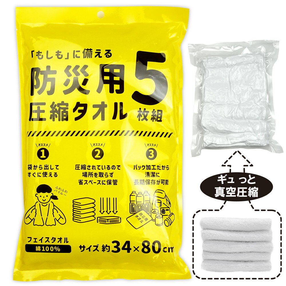 防災用 災害用 圧縮タオル 5枚組 災害対策 備蓄 常備 持ち出し袋に 防災グッズ 真空圧縮パック 非常用 省スペース かさばらない コンパクトフェイスタオル 綿100% 約34×80cm