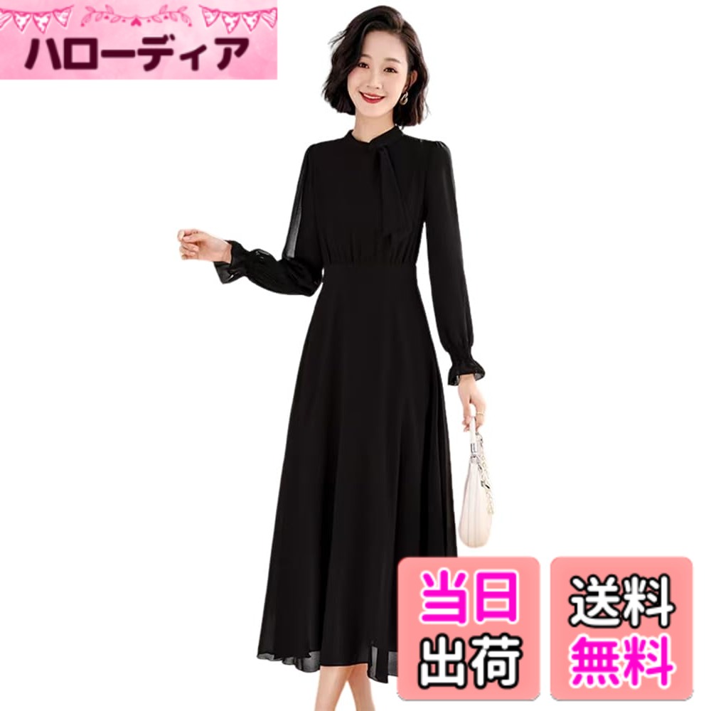 【送料無料】[Collecala] ドレスワンピース レディース春服 秋服 長袖 無地シフォン チープドレス 結婚式ワンピ 二次会 食事会 母親秋服 ハイネック春秋洋服 色:ブラック、サイズ:L